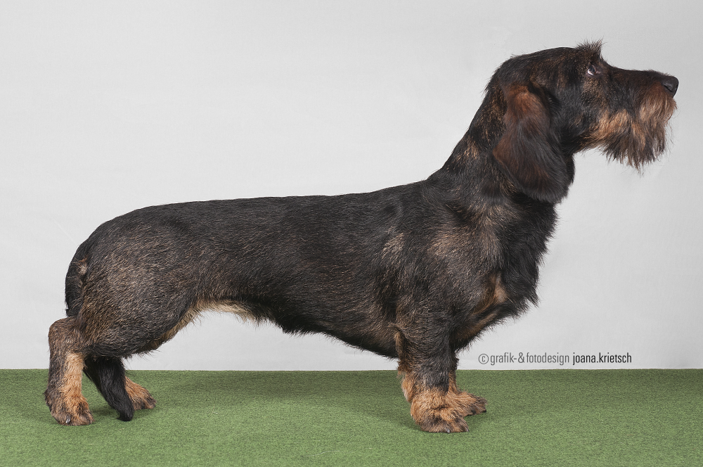 Langgestreckte, großrahmige, jedoch hochelegante Hündin mit harscher Körperbehaarung, dkl. Augen, Ideale Knochenstärke, gelassenes und freundliches Verhalten bei der Tischbewertung. Eine Hündin mit viel Typ und Adel, die trotz enger HH eine Zierde für Ihre Rasse darstellt und sich im Ring gekonnt bewegt. Andreas Tornau |