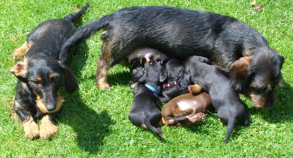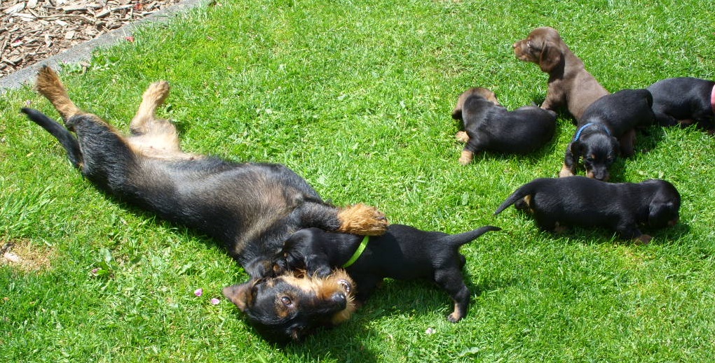 4 Rüden alle schwarz-rot, 3 Hündinnen braun, 1 Hündin dkl. saufarben wurden am 07.06.2015 gewölft.